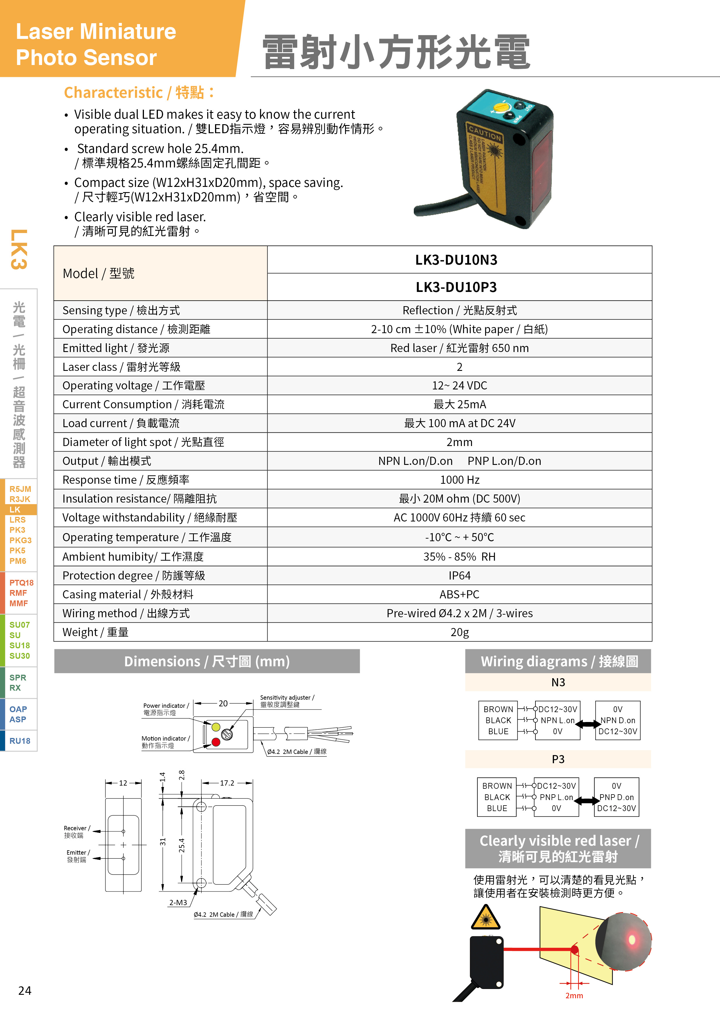 | Wiring method | Pre-wired ?4.2 x 2M / 3-wires |