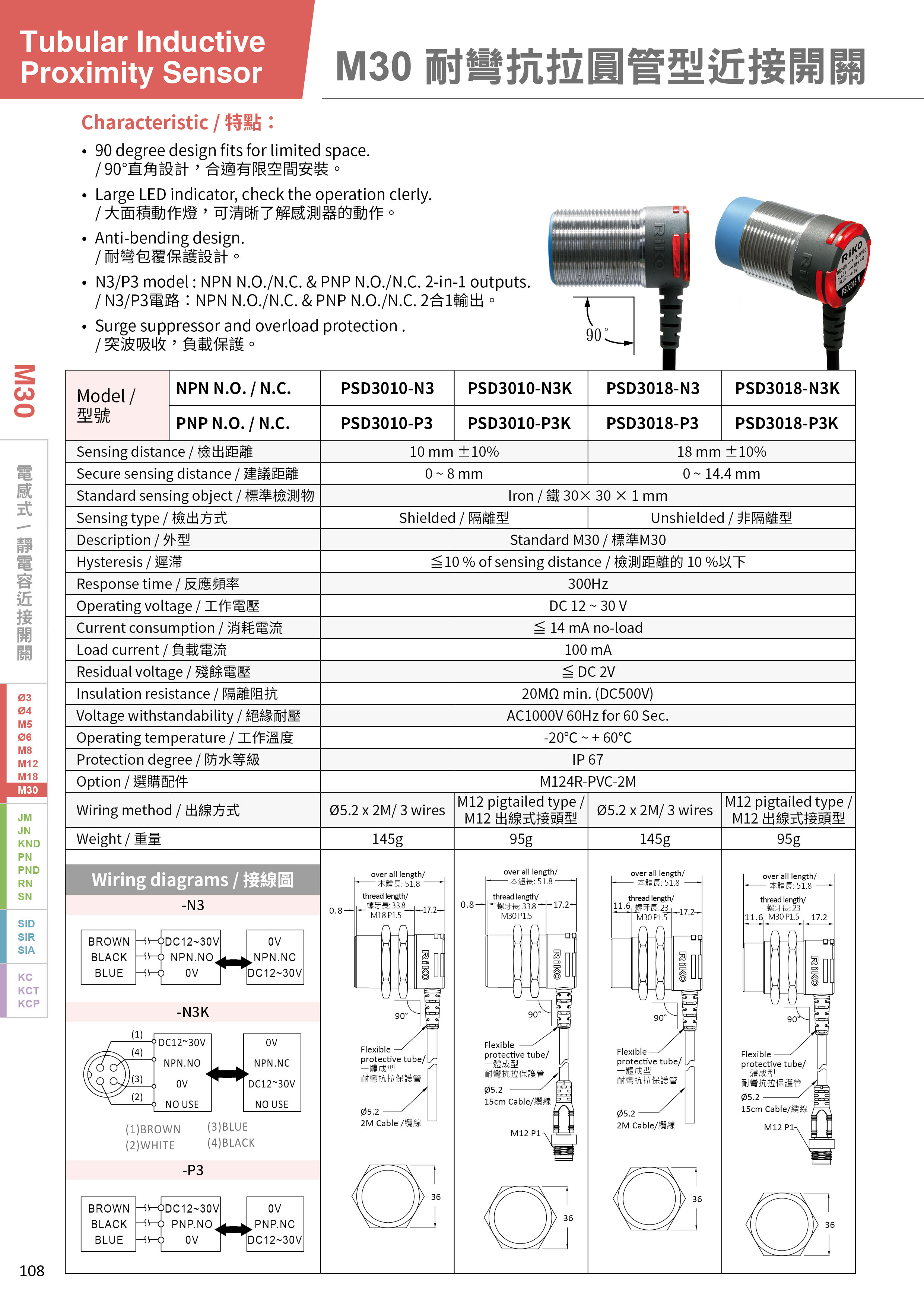 ? 90度直角設(shè)計(jì),合適有限空間安裝。 ? 大面積動(dòng)作燈,可清晰了解感測(cè)器的動(dòng)作。 ? 耐彎包覆保護(hù)設(shè)計(jì)。 ? N3/P3 電路 : NPN N.O./N.C. & PNP N.O./N.C. 2合1輸出。 ? 突波吸收,負(fù)載保護(hù)。