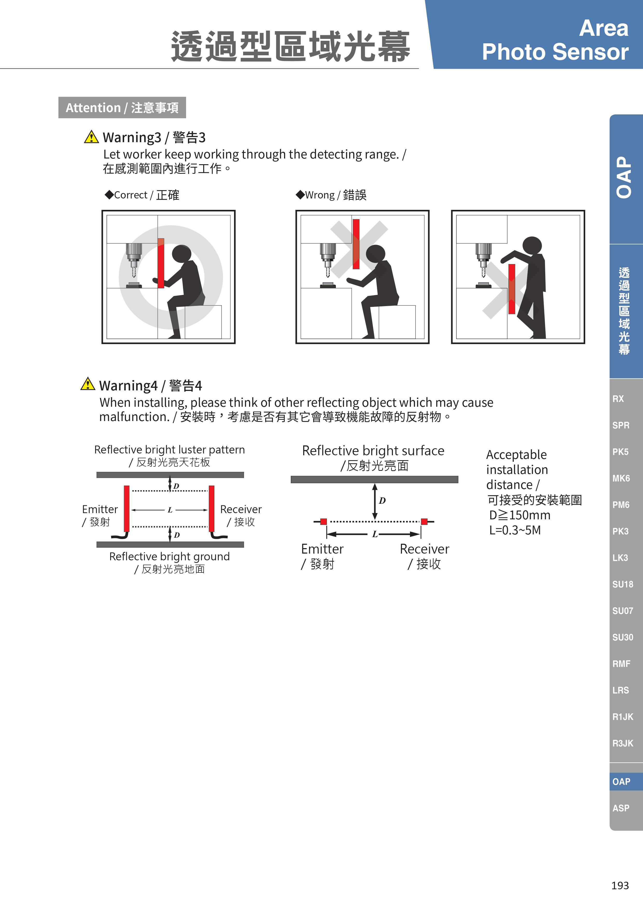| 指示燈 | 在正常通電情況下,LED燈在發(fā)射端光軸被阻隔時,紅+綠燈會全亮。 如果恢復(fù)正常,即發(fā)射端光軸不被阻隔,LED亮綠燈。 |