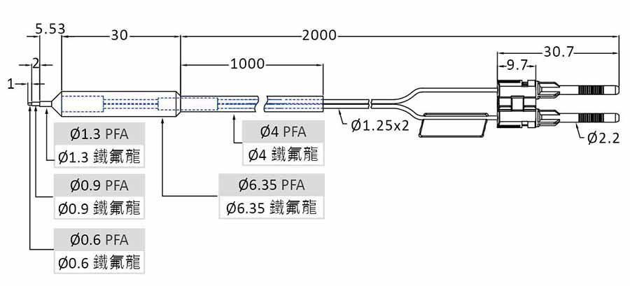 ? 套管材質(zhì):鐵氟龍 ( PFA )